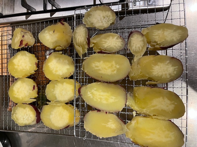 午前中にいただいたお芋を圧力なべで蒸して、カットしました。